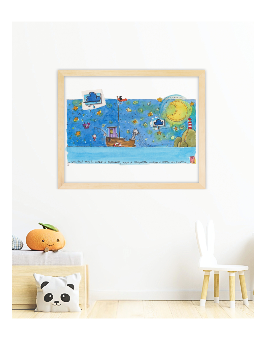 "La Barchetta dei Sogni" è l'opera più rassicurante e meditativa della collezione. Con il suo cielo stellato profondo, le nuvole che portano messaggi e la barchetta che riposa, è l'ideale per accompagnare il momento della nanna, portando un senso di pace. Come recita la frase sul disegno stesso: "Che passi tutto il giorno a disegnare quella barchetta ferma in mezzo al mare..." – un omaggio alla semplicità e alla bellezza dell'attesa.