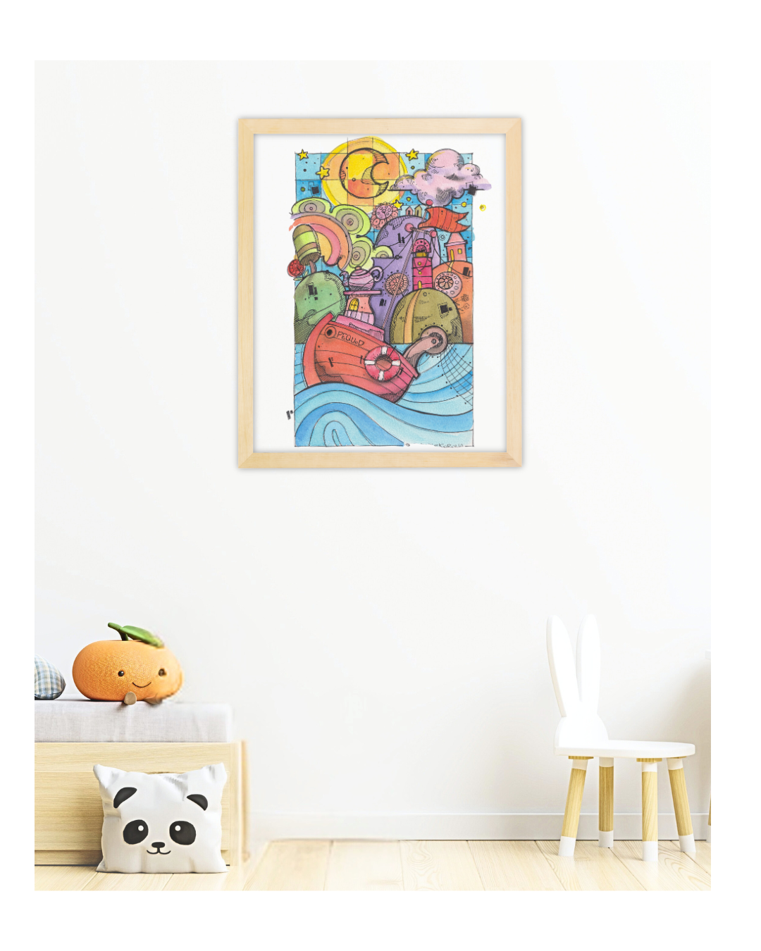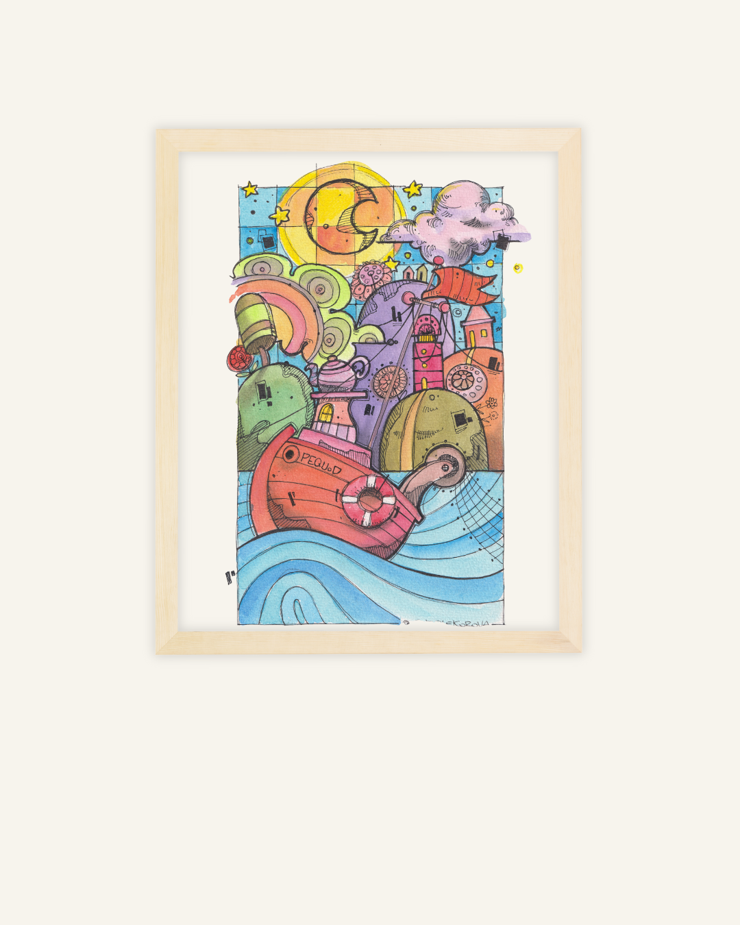 Nata dalla mano di Antonio, questa illustrazione è stata creata per portare la grandezza delle storie di mare in un formato onirico e accogliente. Il disegno unisce la solidità della barca a elementi di pura fantasia, usando una palette cromatica accesa e gioiosa che contrasta con la serietà del titolo letterario. Il risultato è un pezzo unico che celebra l'esplorazione e la curiosità in ogni sua forma.
