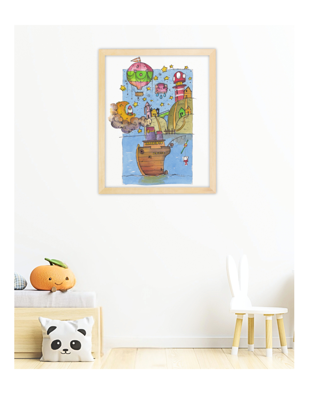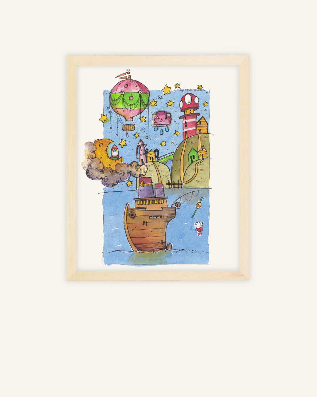 "La Mongolfiera e il Faro" celebra la possibilità di esplorare il mondo, sapendo di avere sempre un punto di riferimento dove tornare. Con i suoi colori vivaci ma delicati, e il faro che veglia sulla navigazione, questa stampa è ideale per infondere un senso di gioia, avventura e stabilità . È perfetta per la cameretta, l'angolo lettura o ovunque tu voglia aggiungere un promemoria visivo del potere di sognare in grande.