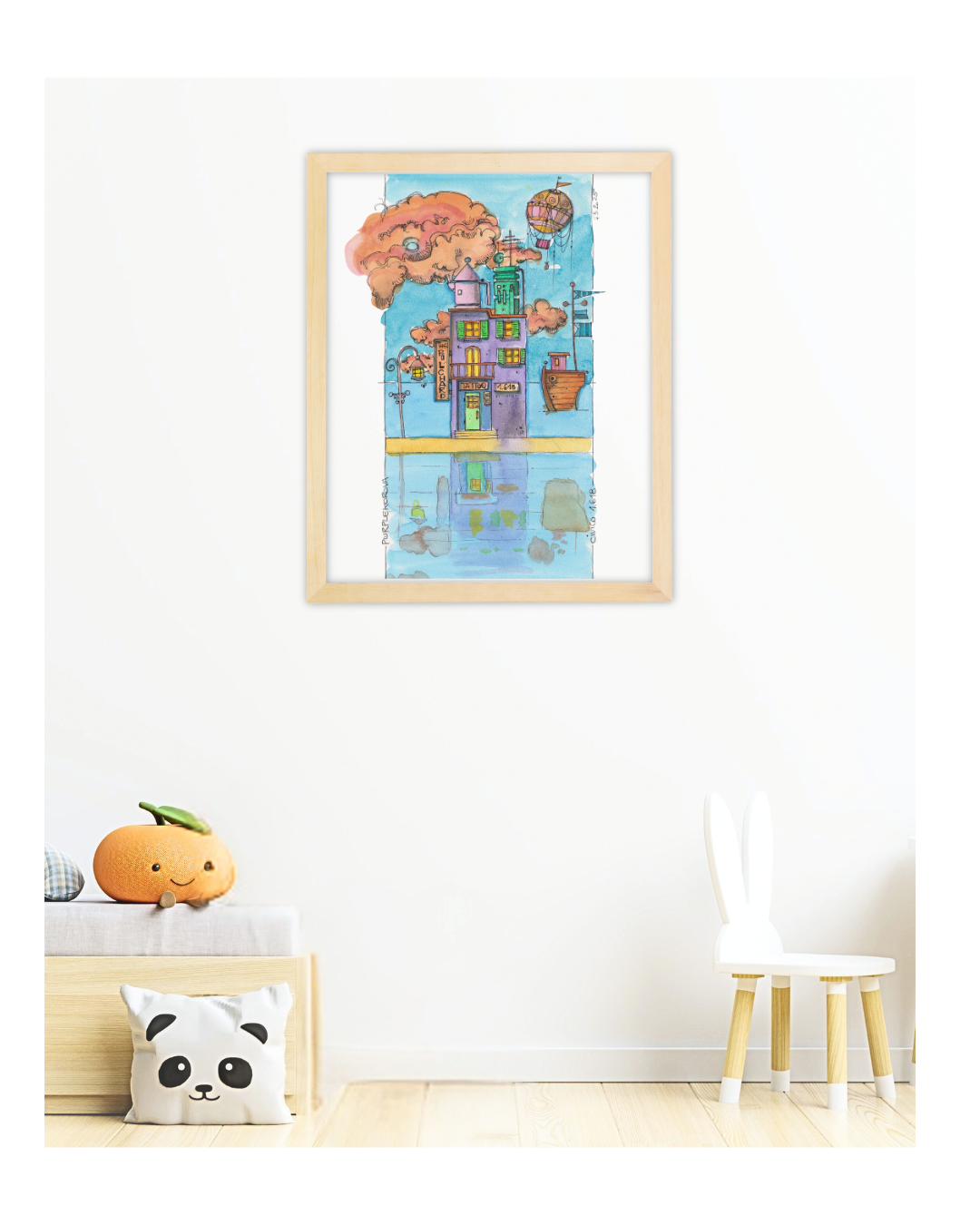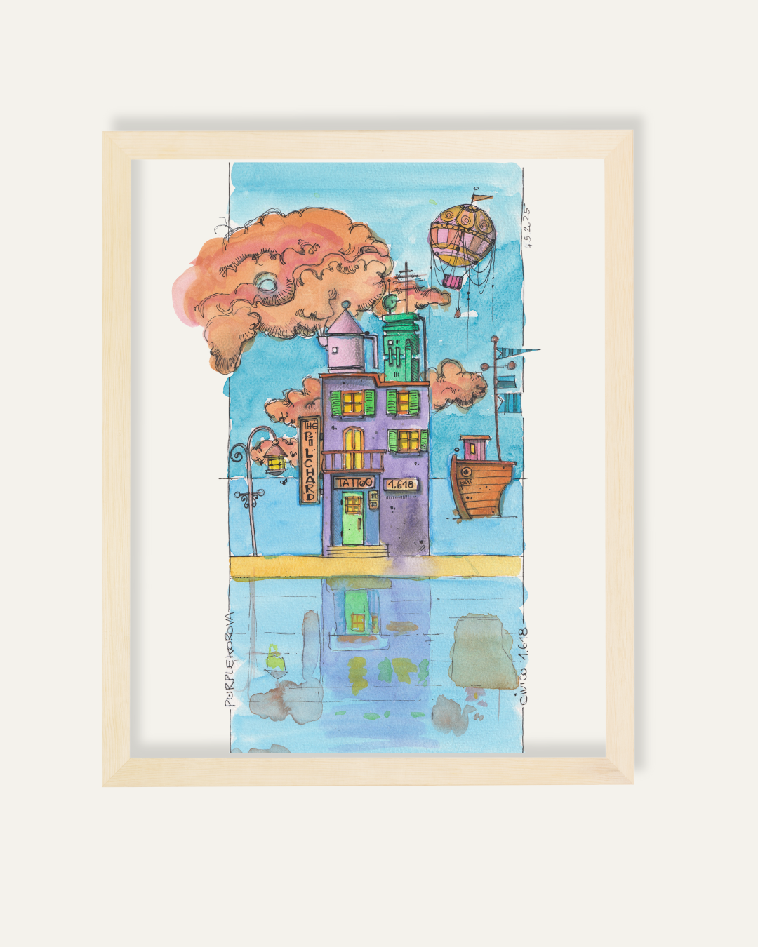 "Civico 1.618" non è solo un disegno, è la rappresentazione del luogo dove nasce la fantasia. Con le sue pareti viola e verdi, le insegne bizzarre ("Tattoo") e il riflesso misterioso nell'acqua, questa stampa ha un'atmosfera bohémien e creativa. È l'opera ideale per chi vuole un pezzo d'arte con una storia personale legata al brand e che aggiunga un tocco di architettura fantastica e vibrante al proprio ambiente.