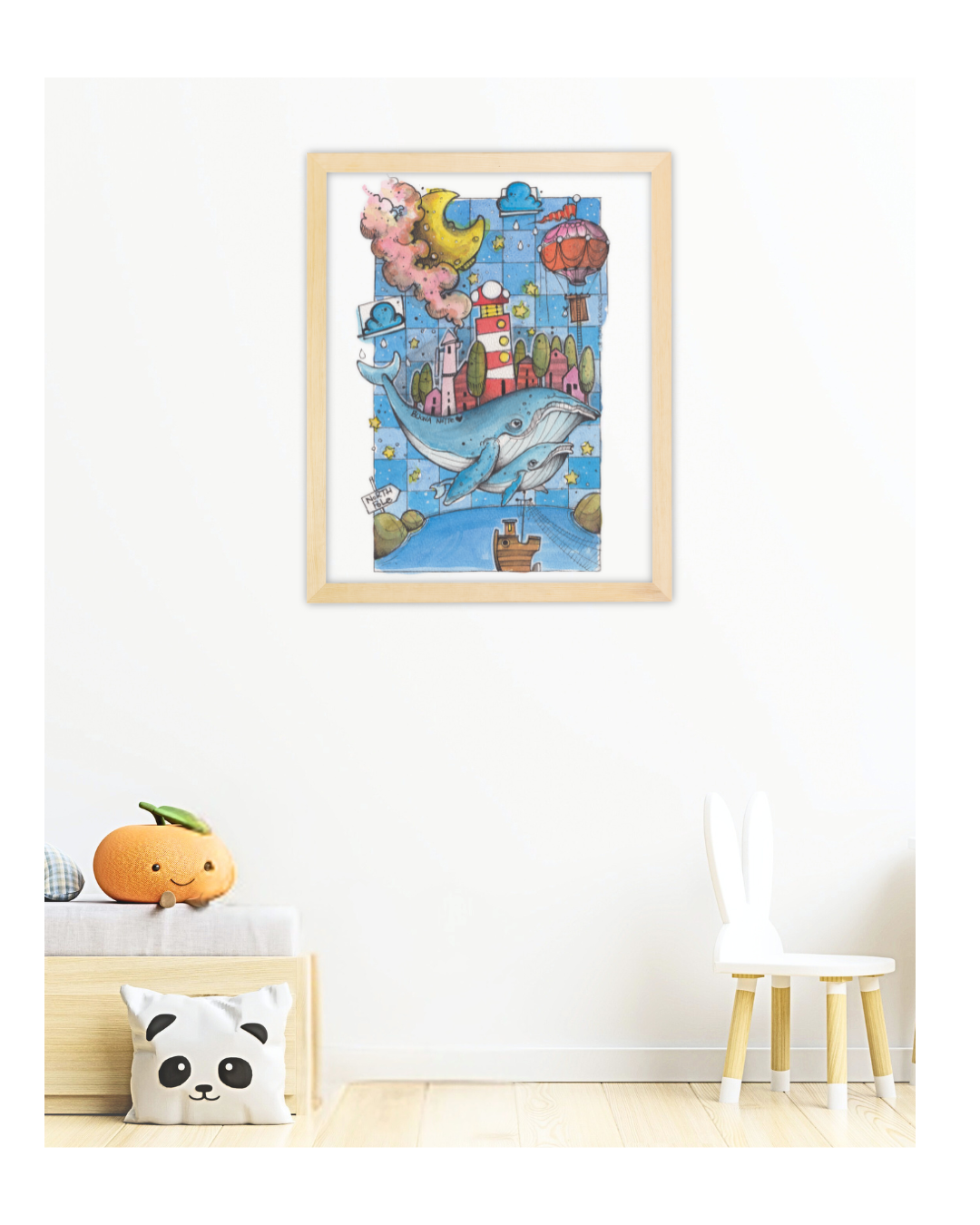 Questa stampa è un inno alla protezione e alla meraviglia. Immagina una notte in cui due balene sorridenti volano sopra un villaggio addormentato, scortate da una luna gialla e da mongolfiere color pastello. "Buona Notte - Le Balene dei Sogni" è l'elemento d'arredo che infonde calma e fantasia, trasformando la cameretta in un santuario di pace e incredibili avventure notturne.