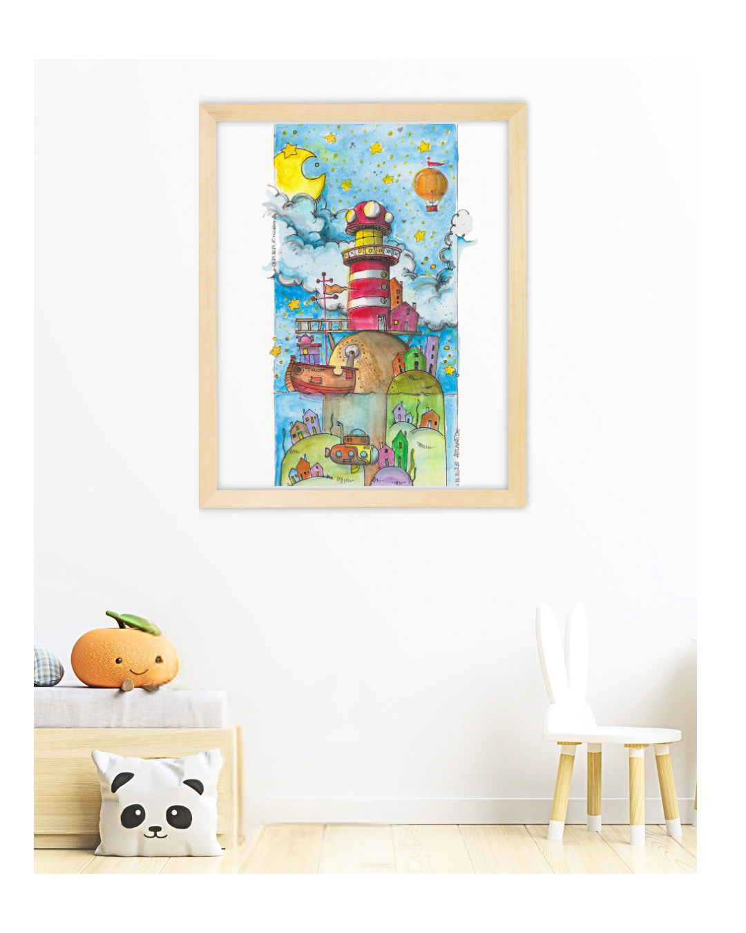 Lascia che la luce di Atlantide, con il suo faro striato e i tetti colorati, guidi i sogni. Questa stampa è molto più di una decorazione: è una porta verso l'immaginazione, perfetta per stimolare la curiosità e la quiete, rendendo ogni stanza un luogo di meraviglia.