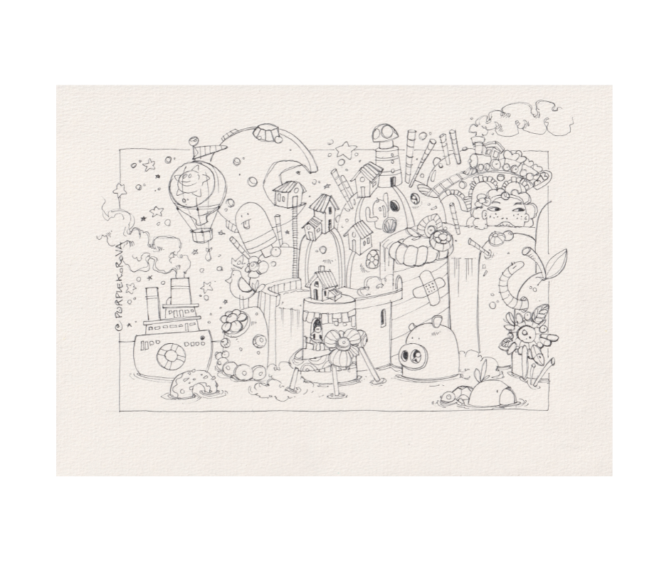Ti sei mai chiesto da dove arrivano le nuvole più soffici? "Cloud Factory" ti porta nel cuore pulsante della produzione onirica di Purplekorova. In questa fabbrica fantastica, ciminiere gentili emettono vapori profumati che si trasformano in sogni, mentre navi volanti e trenini instancabili trasportano carichi di meraviglia tra colline di ingranaggi e fiori giganti. È un’opera che celebra l’operosità della fantasia, dove ogni tubo e ogni bullone ha una scintilla di magia. Un disegno perfetto per chi ama le atmosfere "steampunk" rivisitate con la dolcezza e l'ironia tipica del nostro mondo.