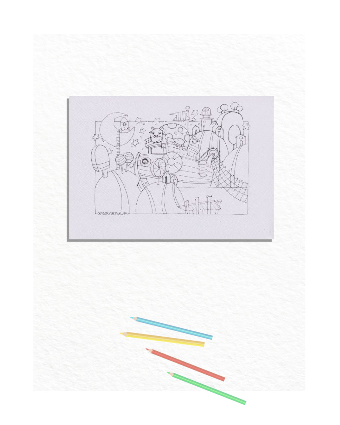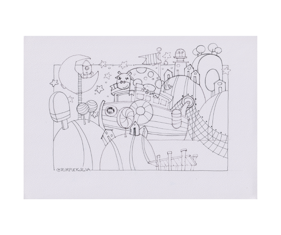 In questo lavoro, Antonio gioca con il surrealismo pop. La composizione è ricca di elementi circolari e linee sinuose che rendono l'esperienza della colorazione fluida e dinamica. È un pezzo che celebra il lato più leggero e divertente del brand Purplekorova: non c'è una regola su di che colore debba essere una mucca spaziale o un cielo fatto di stelle e dolciumi. La libertà è totale, proprio come nel sogno che ha ispirato questo disegno.