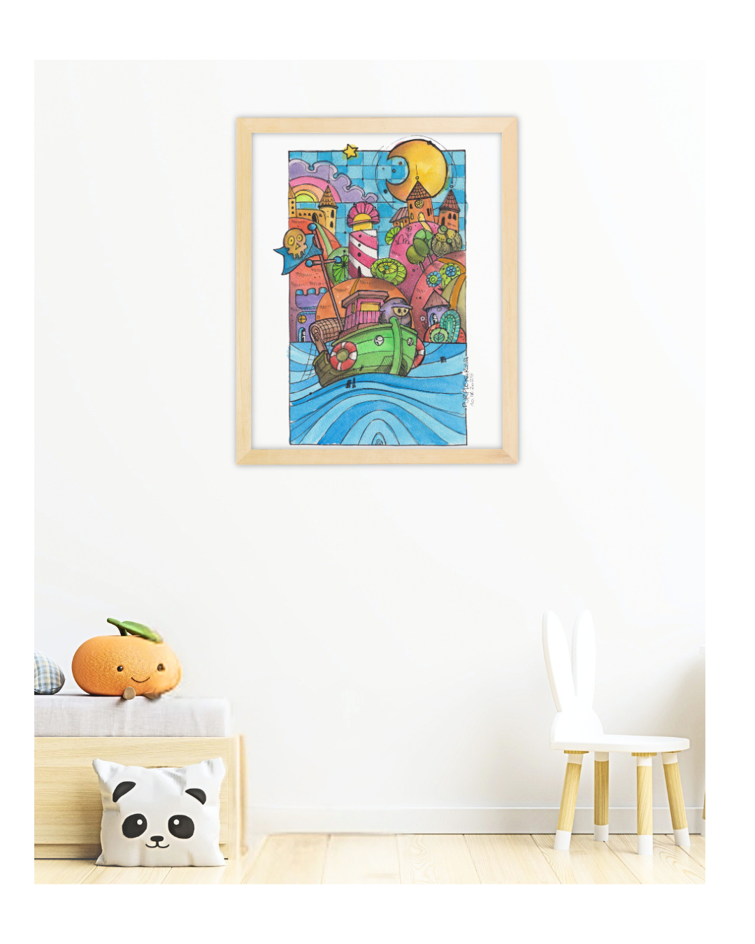 C'è un porto dove le onde parlano, la luna osserva silenziosa e ogni casa sembra ridere di luce propria. "Il Porto dei Colori" è la stampa perfetta per chi cerca un elemento d'arredo che sia al tempo stesso poetico e pieno di vita. È un invito costante a celebrare la fantasia, ideale per la cameretta dei bambini, studi creativi o come regalo unico.