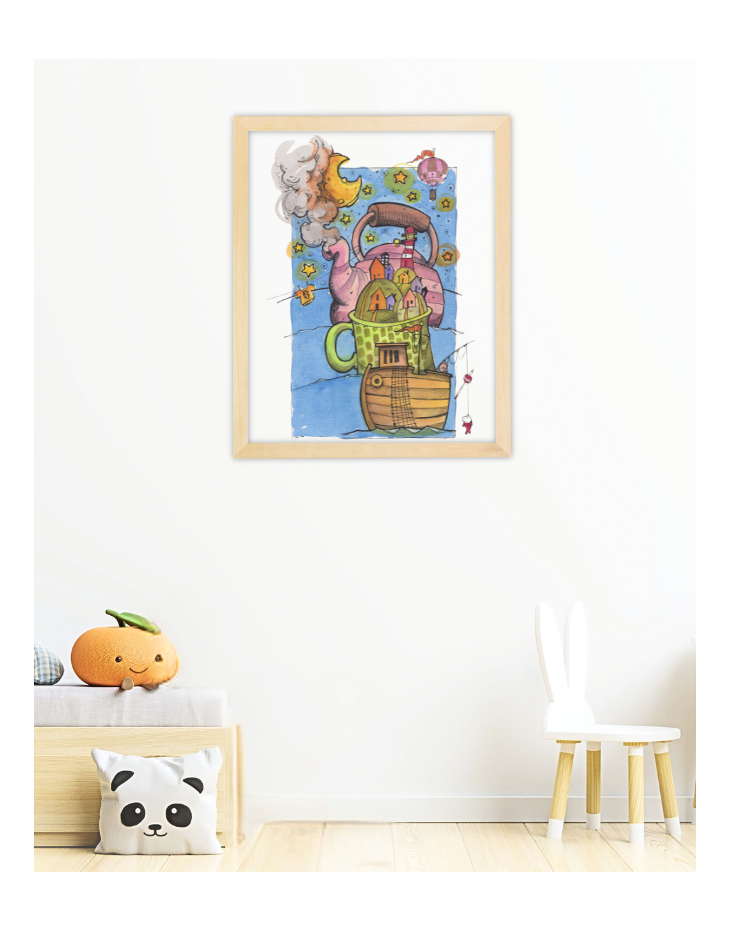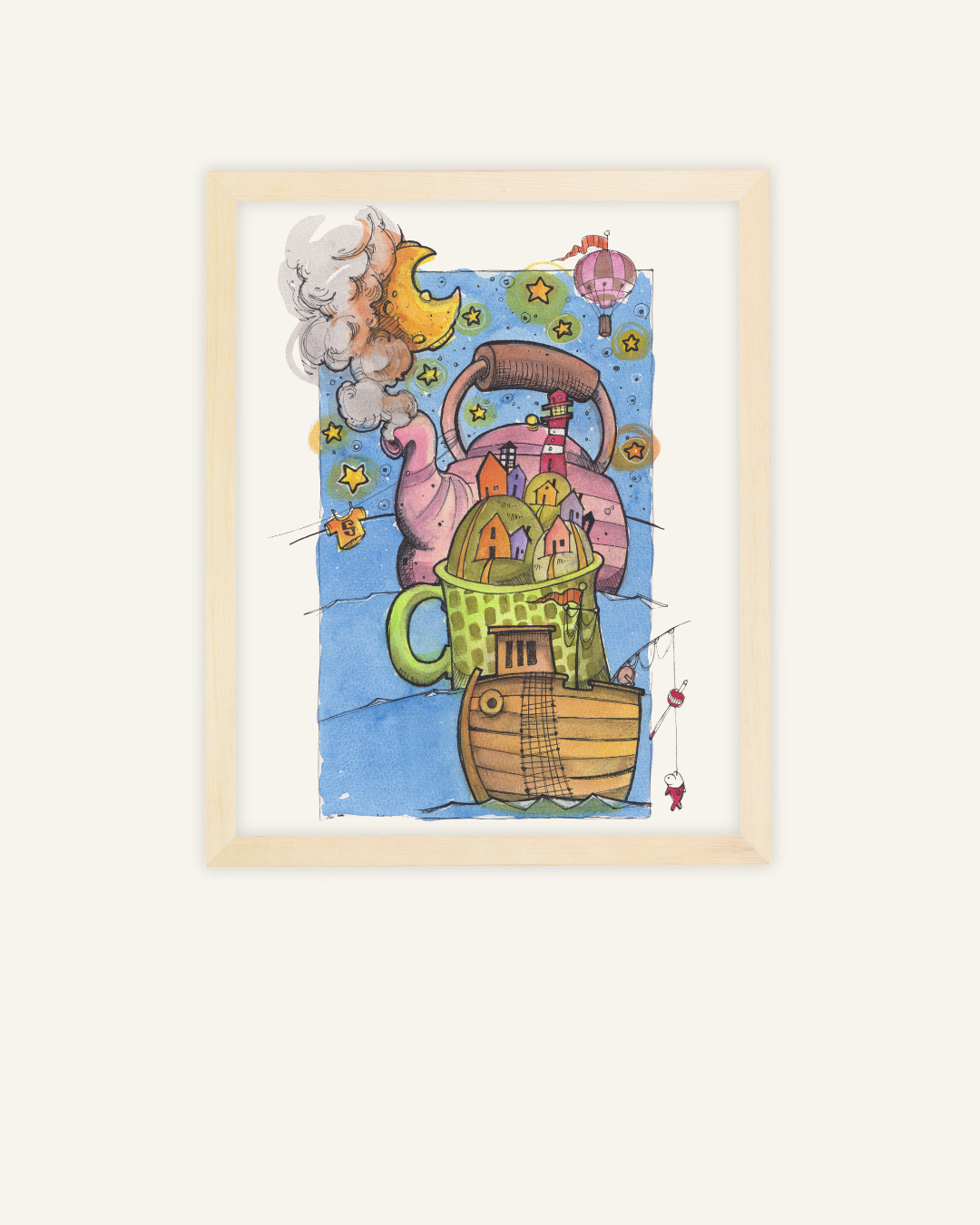 Nata dalla mano di Antonio, quest'opera esplora l'idea di architettura galleggiante e di rifugio sicuro. L'originale è un trionfo di dettagli ad acquerello e inchiostro, dove ogni finestrella e ogni tazza è disegnata con cura meticolosa. È un pezzo che non solo decora, ma racconta una storia: la vita può essere un viaggio stravagante, purché si abbia un porto accogliente dove tornare, anche se quel porto è una teiera.