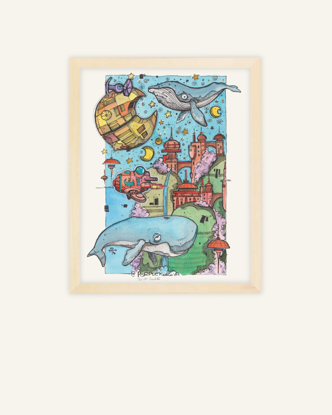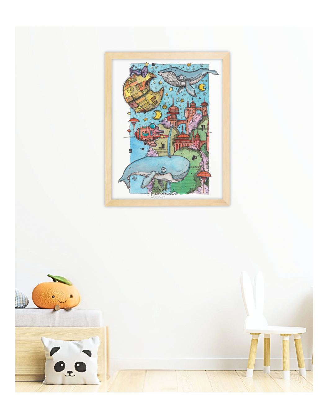 "Le Balene della Luna" è un invito ad espandere i confini del sogno. Questa illustrazione fonde mondi: il fascino delle balene con l'architettura fantastica di una città sospesa e una luna che sembra un'astronave da esplorare. È una stampa che non smette mai di sorprendere e che svela nuovi dettagli ad ogni sguardo. Perfetta per stimolare la curiosità, la creatività e per dare un tocco distintivo e inaspettato alla stanza.