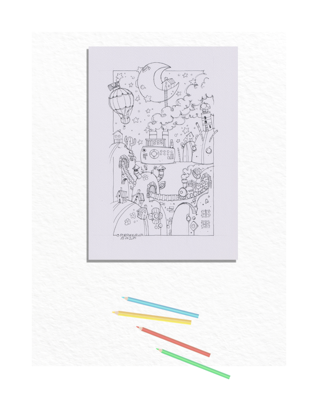 Lasciati cullare dal ritmo di un viaggio che sfida la gravità. "Moon Train" ti porta nel cuore pulsante di una notte magica, dove un trenino a vapore carico di cuori attraversa ponti sospesi e tunnel incantati. Dominato da una luna crescente che ospita una piccola dimora segreta, questo disegno è un tripudio di dettagli: navi che solcano l'aria, mongolfiere pirata e colline che sembrano creature viventi. È il soggetto perfetto per chi vuole evadere dalla realtà e immergersi in un'atmosfera notturna dolce e sognante.